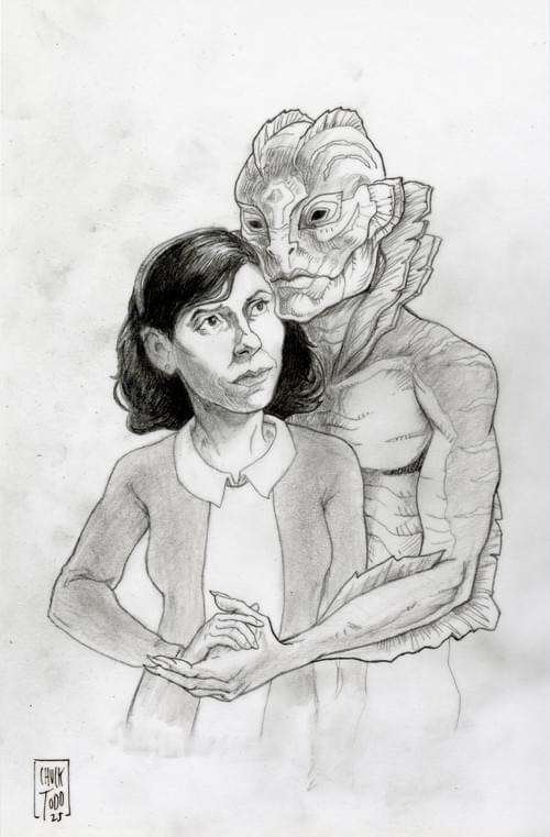 Elisa and the Creature from Guillermo Del Toro's The Shape of Water. Sketch/study on vellum by Chuck Todd.